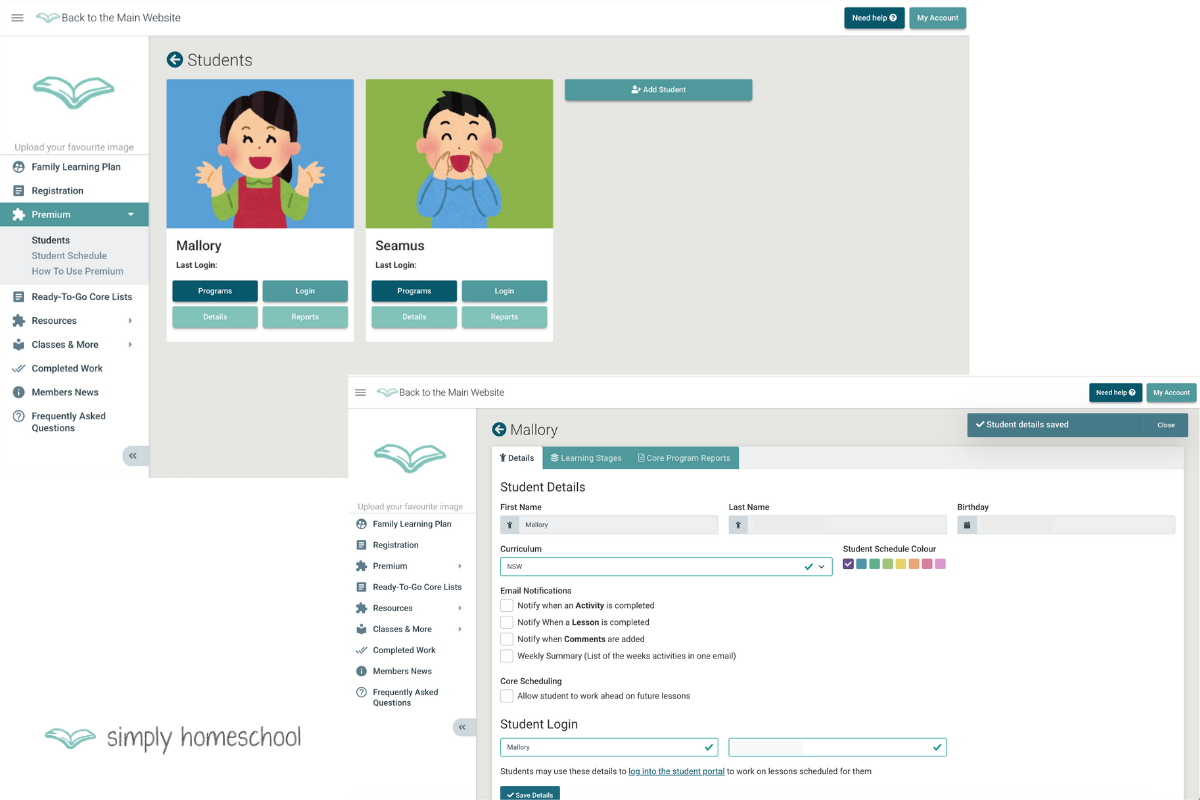 - An individual student profile and login (Premium Single) or multiple student profiles and logins (Premium Family) – with photos, colour themes, and individual student tracking.